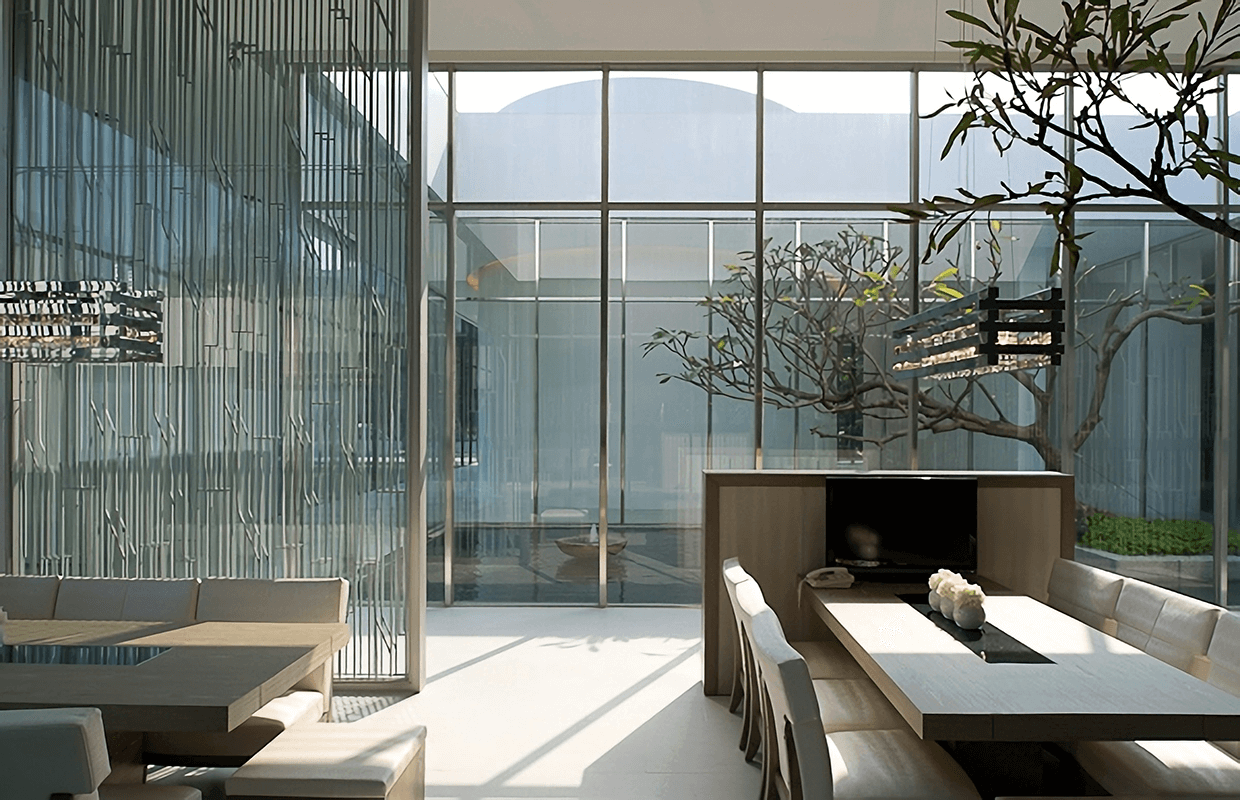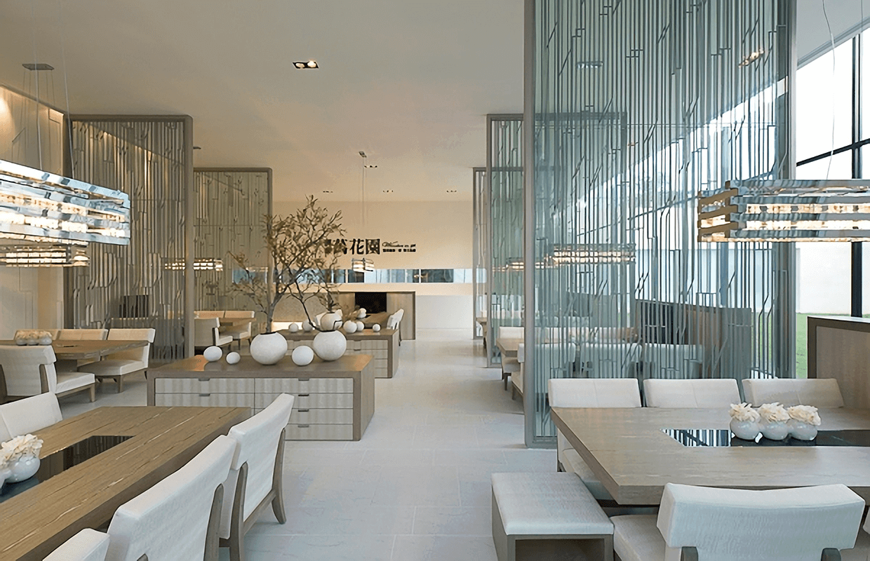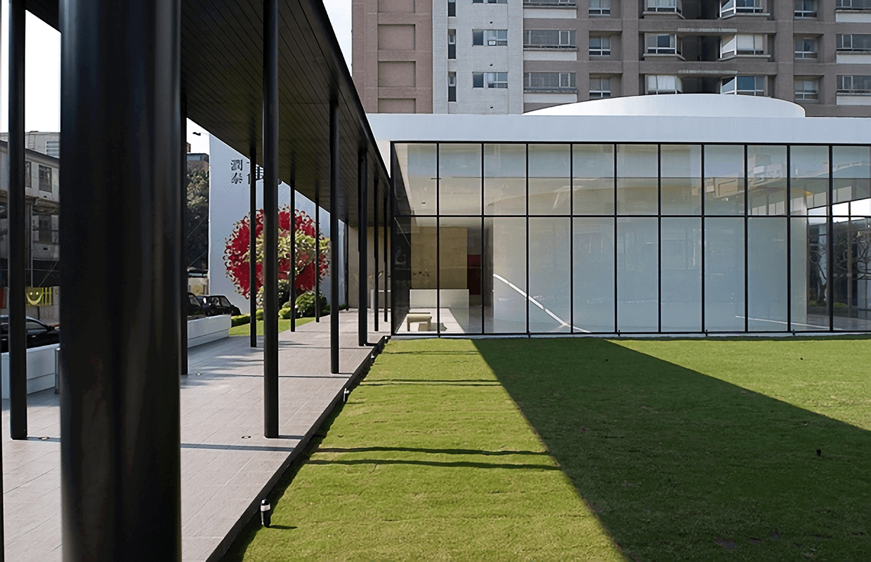 接待中心位於國小與傳統市場的週邊,所以將主要建物退縮至後方,前方讓出大面積的緩衝空間,以過度的空間來沉靜雜亂的心情,室內無色的材質與大樹景觀作融和,產生前所未有的空間氛圍