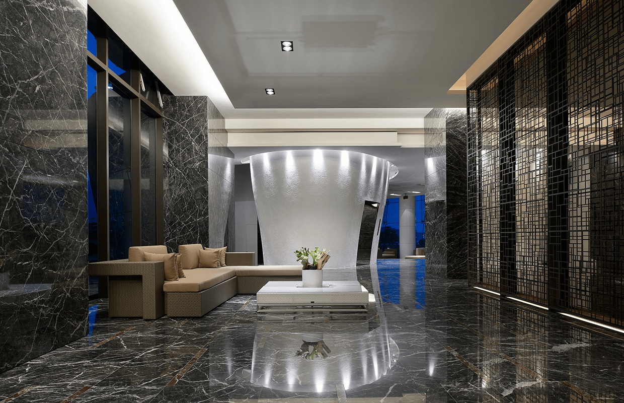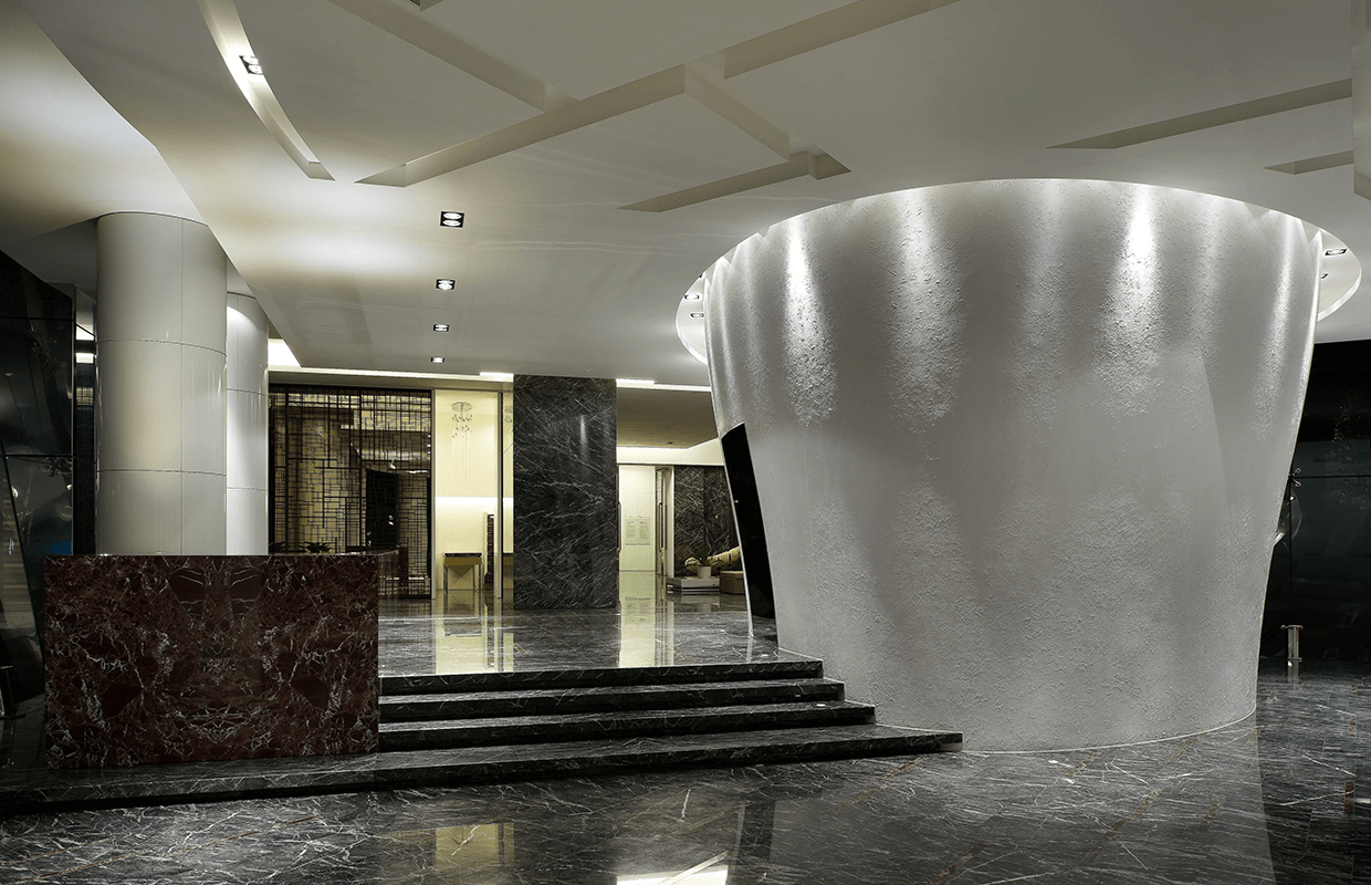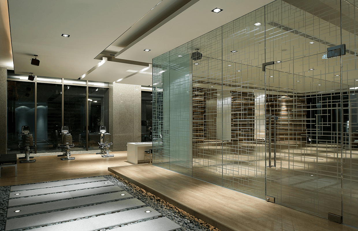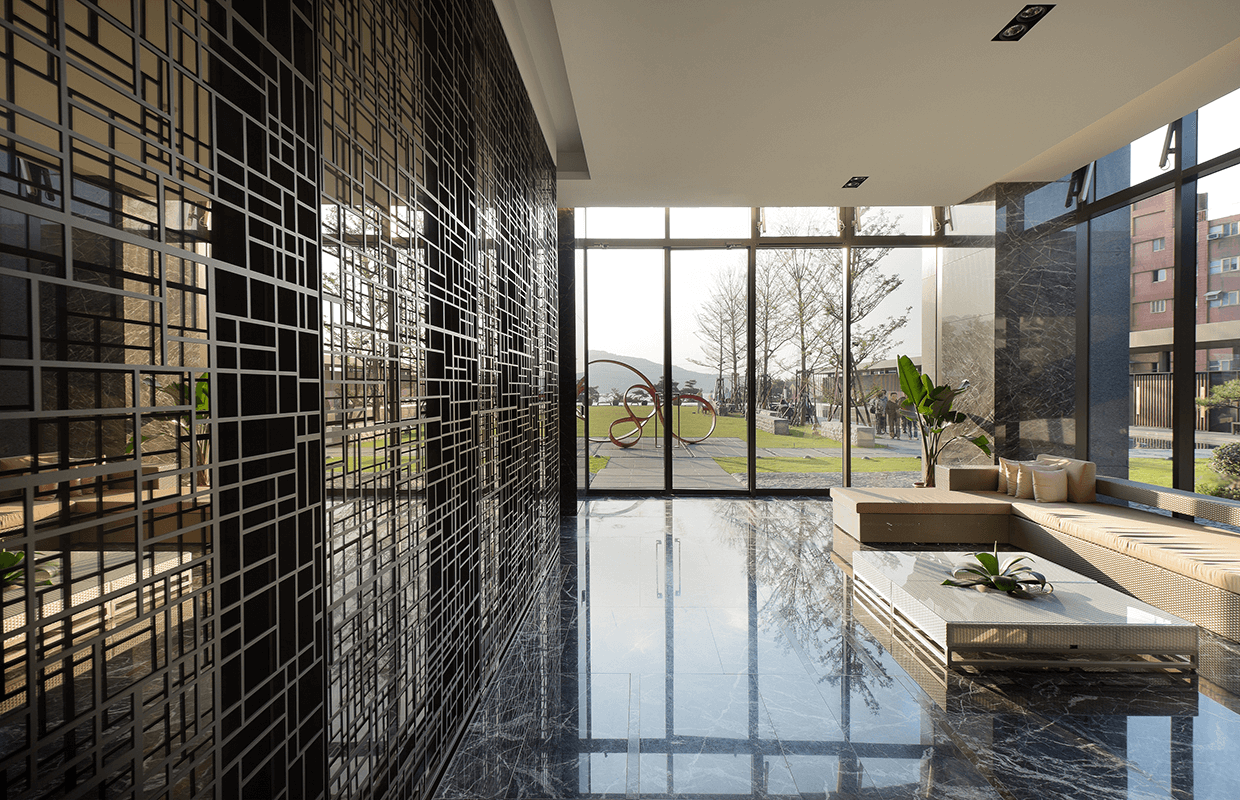 以蒙德里安的意念Pattern使用在不同的材質做法上,延伸貫穿的融入每個空間,鐵件,石刻,天花版造型,玻璃鏡子噴砂,門片花紋以此代表現代主義的進化延伸,理性且不露痕跡的表現在空間之中