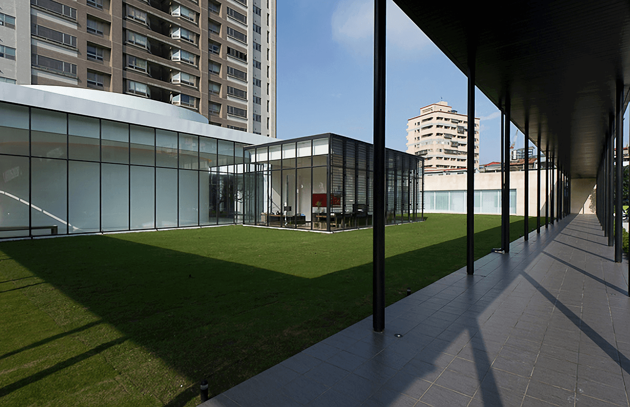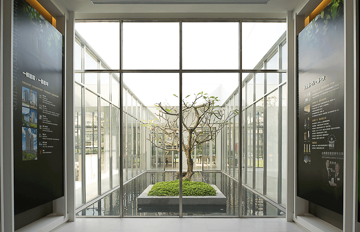 接待中心位於國小與傳統市場的週邊,所以將主要建物退縮至後方,前方讓出大面積的緩衝空間,以過度的空間來沉靜雜亂的心情,室內無色的材質與大樹景觀作融和,產生前所未有的空間氛圍