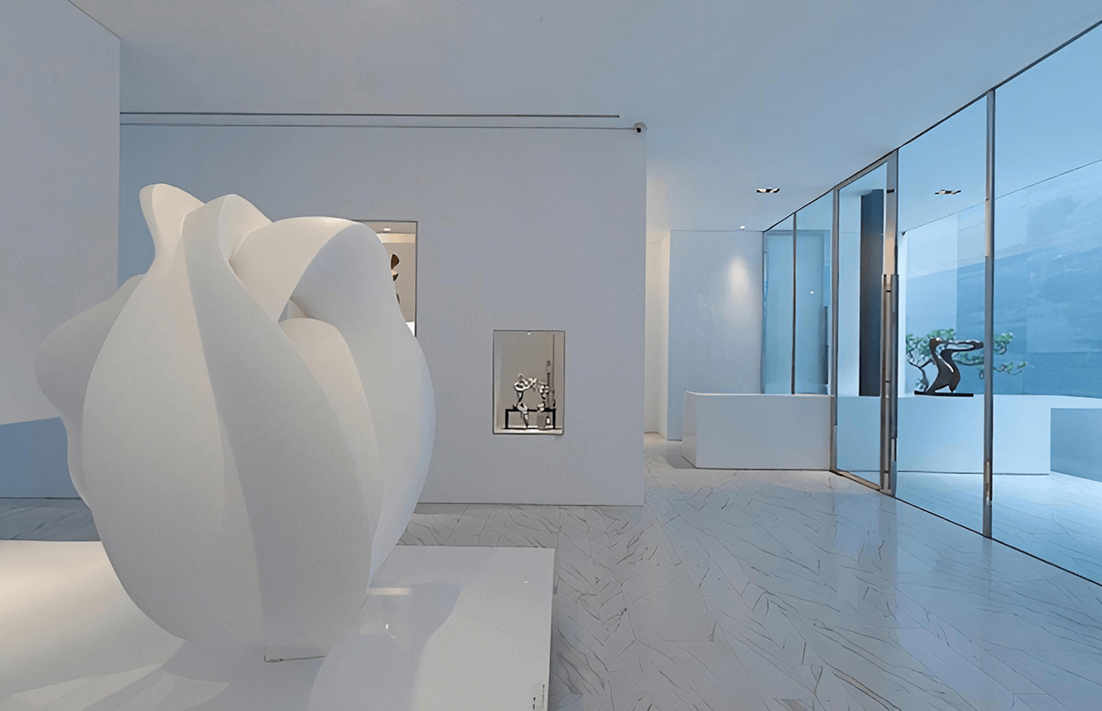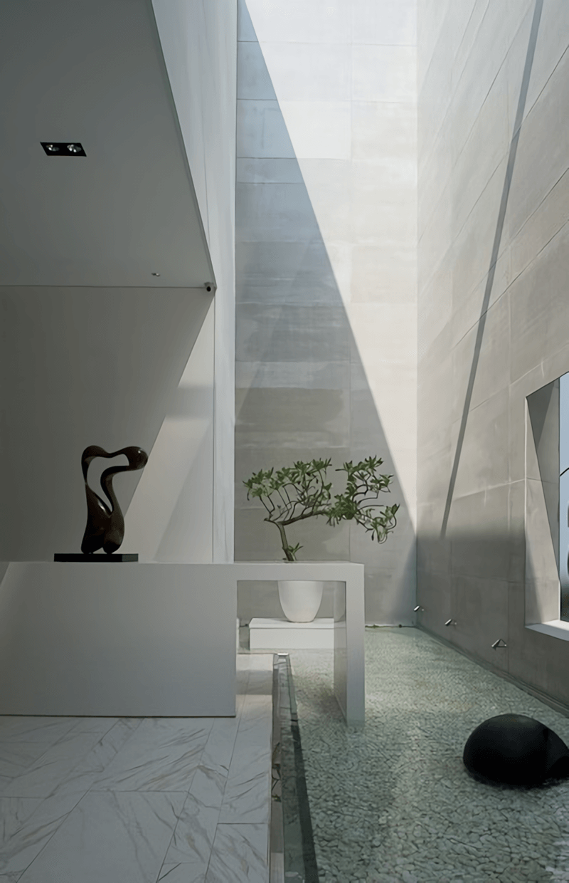 此空間為地產銷售中心,位處台北市精華地段之中心 開發商特地找來旅美知名服裝設計師 吳季剛做房地產之代言 所以在整個建築體設計初期就將服裝.布料等相關素材納入整體設計的考量 因此基地位處街道較狹小的道路 與鄰房的距離非常近 所以規劃上以一個盒子的形式呈現 盒子上的紋理取了各式布料,包含麻,絲,毛線,大編織等等的布料的壓縮圖像 室內純白空間搭配楊柏林老師的雕塑作品做空間的結合展現 於美術館般的空間中 沉浸心靈