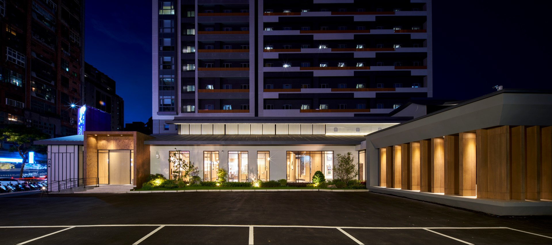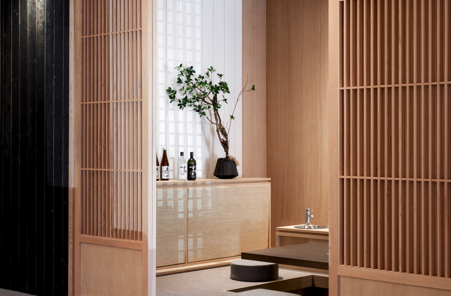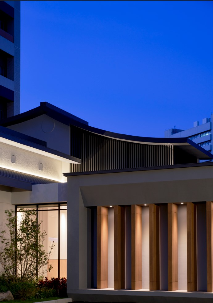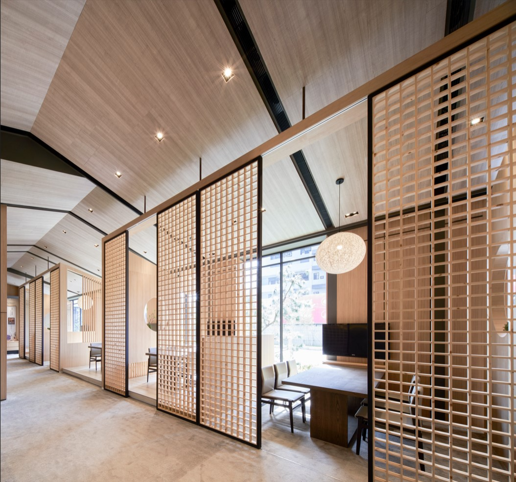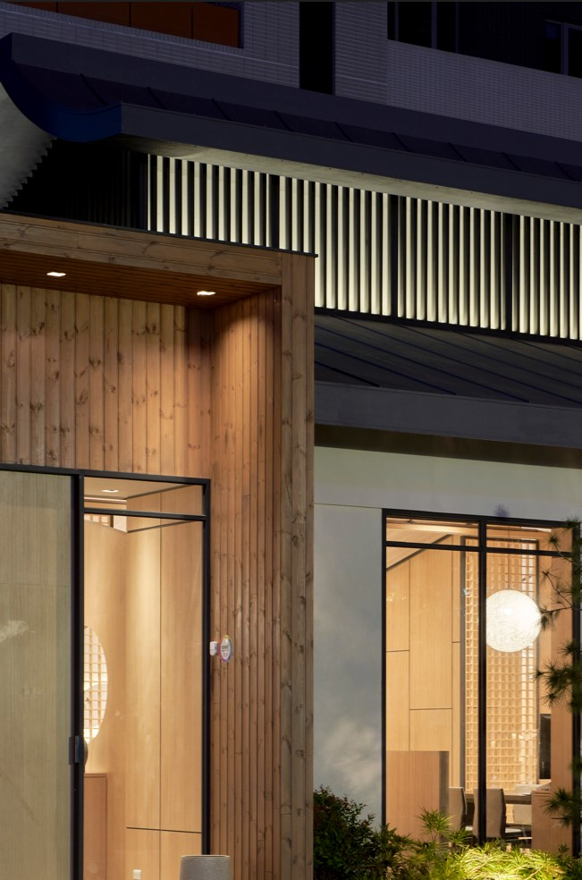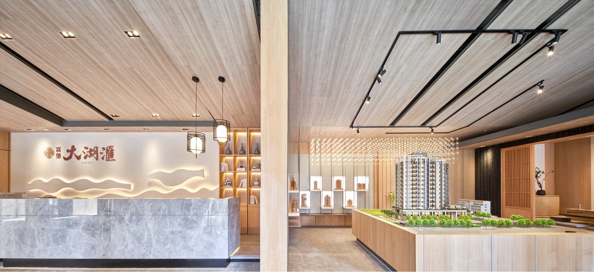 接待中心設計以《日式建築群》為概念,保留日式建築的神韻及精髓,用當代建築設計語言加以詮釋。 入口處大大一個《框》以框景的概念作為為入口意象。 屋頂以現代材料鋁板的形式來取代日式傳統的黑瓦,與豎向木格柵行成不同的層次的光影變化。