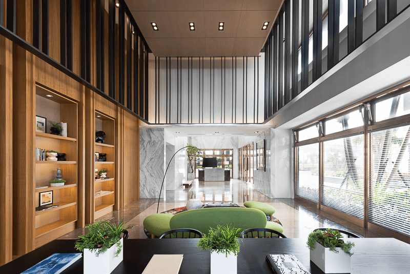 此集合式住宅位處於新北市五股洲子洋重劃區 算是偏工業區的新興開發區域 重新塑造了此區域的住宅品質,以及吸引年輕族群往南遷移居住 且可看到水岸公園 外觀設計採用白色的現代線條韻律與水岸相呼應 公設風格延續外觀的現代風格 主打年輕人購屋的需求 顏色我們刻意放淡 希望整體空間輕巧時尚 跳脫老舊工業區的概念 空間中我們用比較大的動作 挑空上方的序列格柵 來圍塑貫穿整體的風格 並在主要入口的全白挑空中 垂掛了姿態有如布幔輕巧的玻璃管造型 示意了外觀白色線條與水岸的語言 最後用家具飾品來 主導整體空間的風格與顏色 屋頂跟空中花園銜接了一個提供給住戶聊天聚會的陽光屋 享受陽光的洗禮與綠意的沐浴 以度假屋的態度在規劃公設之中的設施 此手法態度最終在此工業區的新興重劃區域得到熱烈迴響